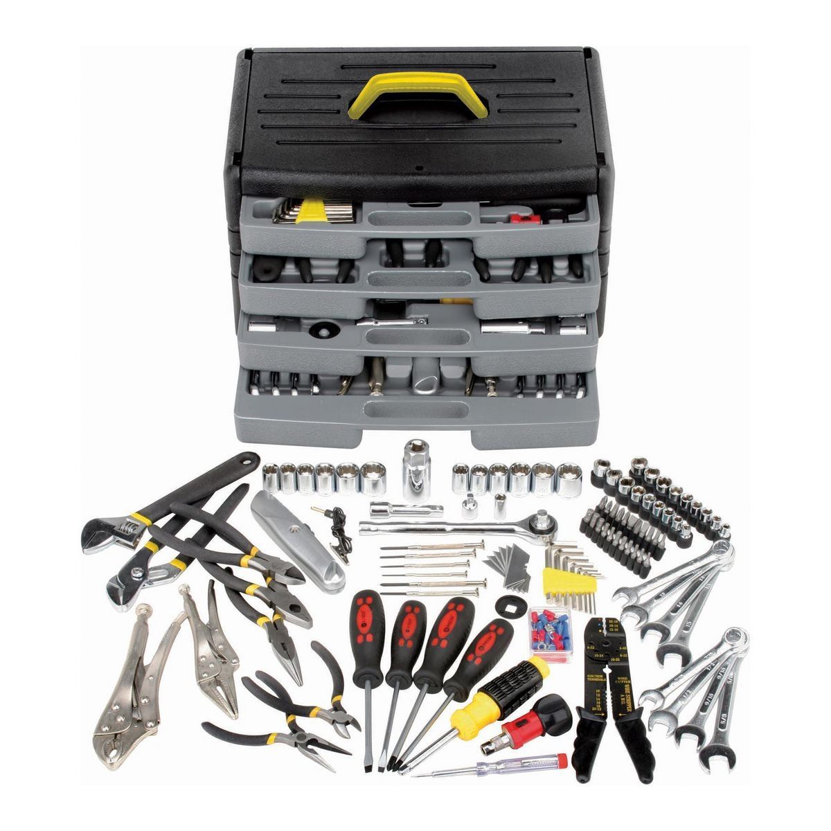 Este juego de herramientas es el juego de inicio perfecto, pero también es un excelente juego de respaldo para guardarlo en su vehículo para reparaciones de emergencia. Ideal para la reparación de automóviles o el mantenimiento del hogar, este juego de herramientas duradero con triple revestimiento de cromo tiene casi todo lo que necesita. Este juego de herramientas incluye 105 piezas empacadas en un espacioso baúl de 4 cajones con un asa conveniente para facilitar el transporte. Este práctico juego de herramientas cuenta con dados y llaves de acero al carbono templado para una larga vida útil.
